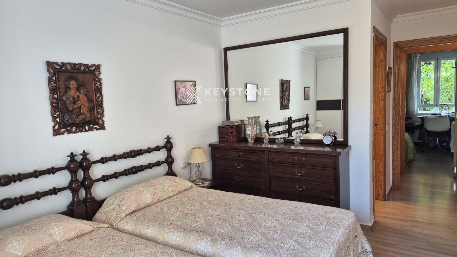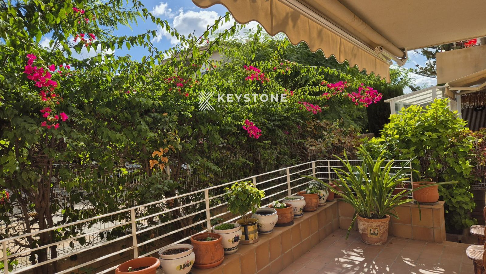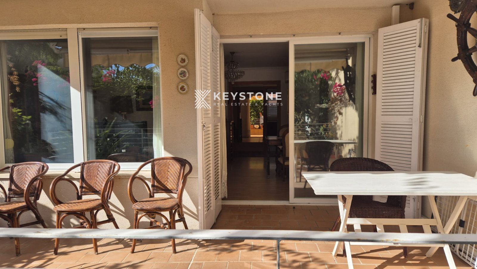 It offers three double bedrooms with fitted wardrobes and two full bathrooms, one en suite. The kitchen-dining area and bright living room open directly onto a south-facing terrace, perfect for relaxing under the Mediterranean sun.