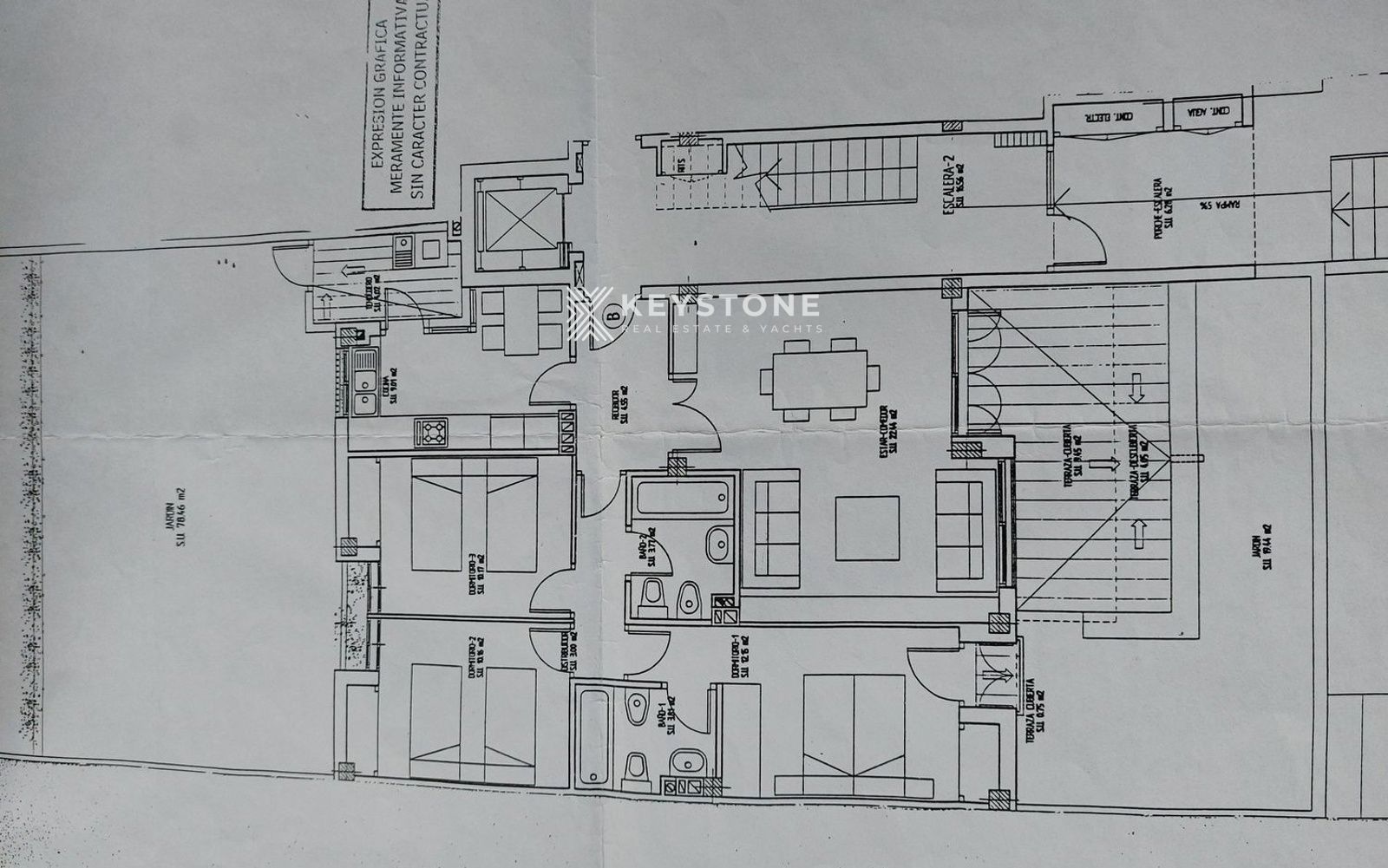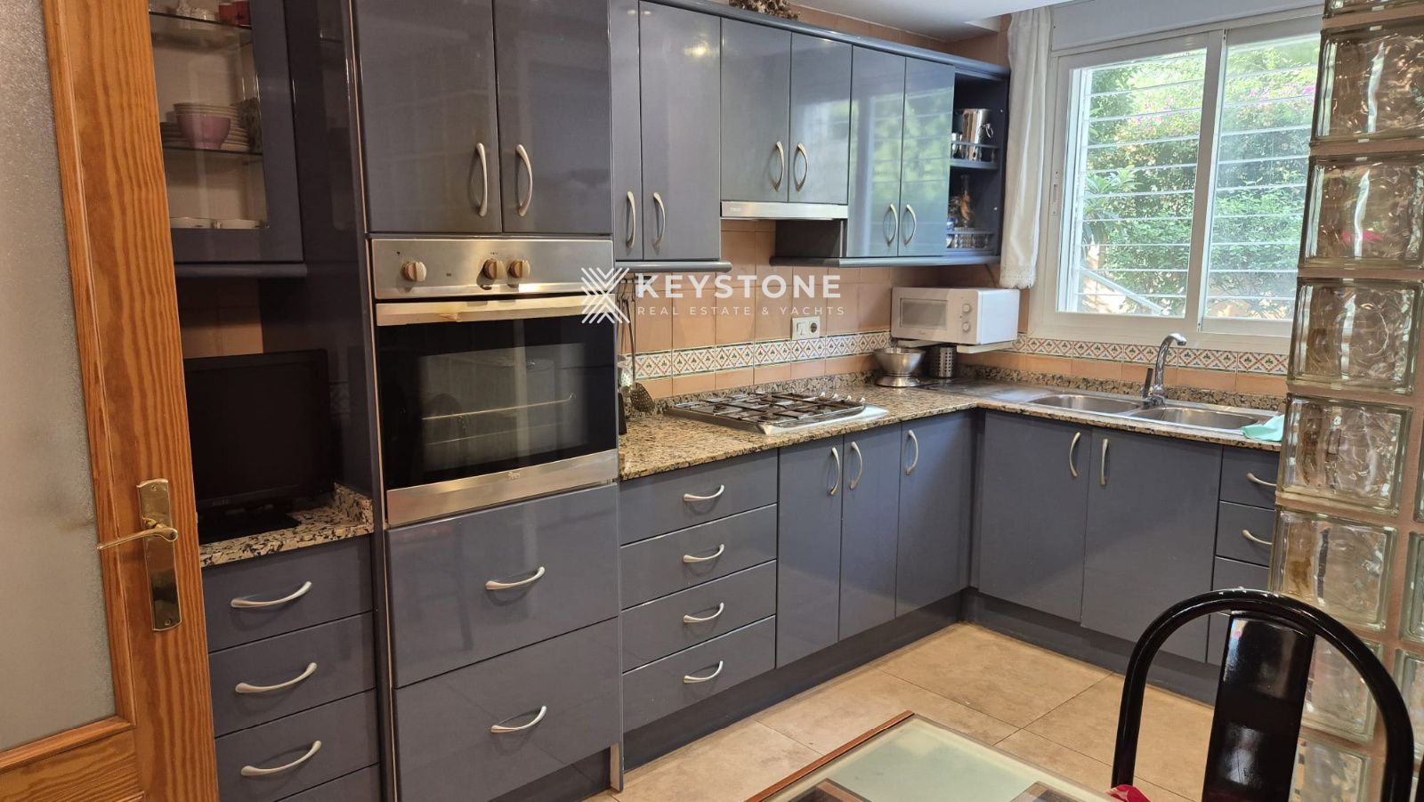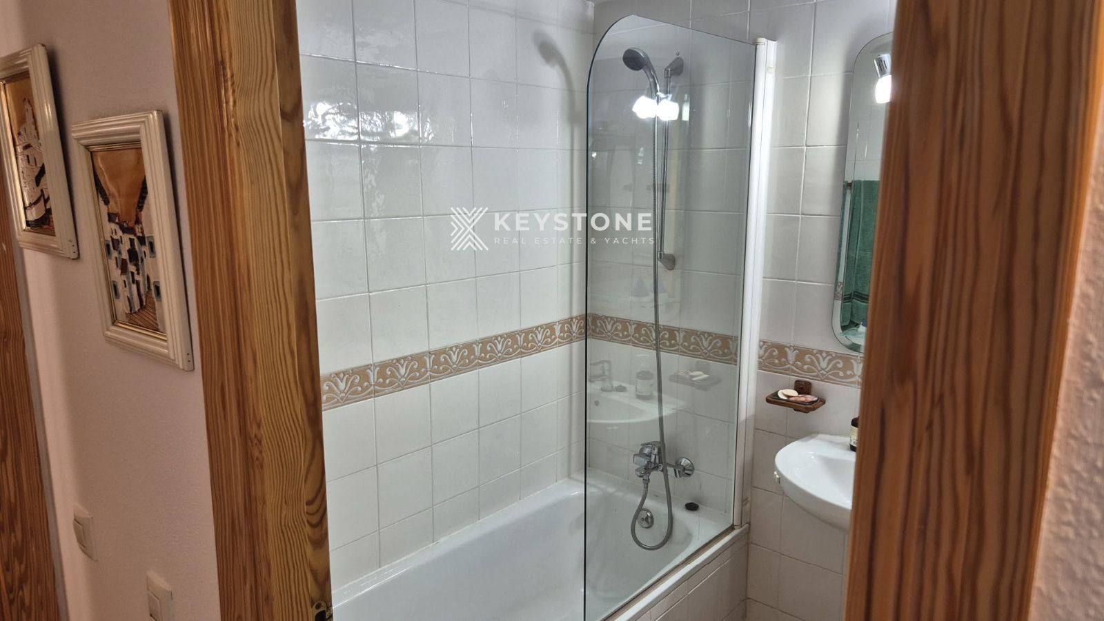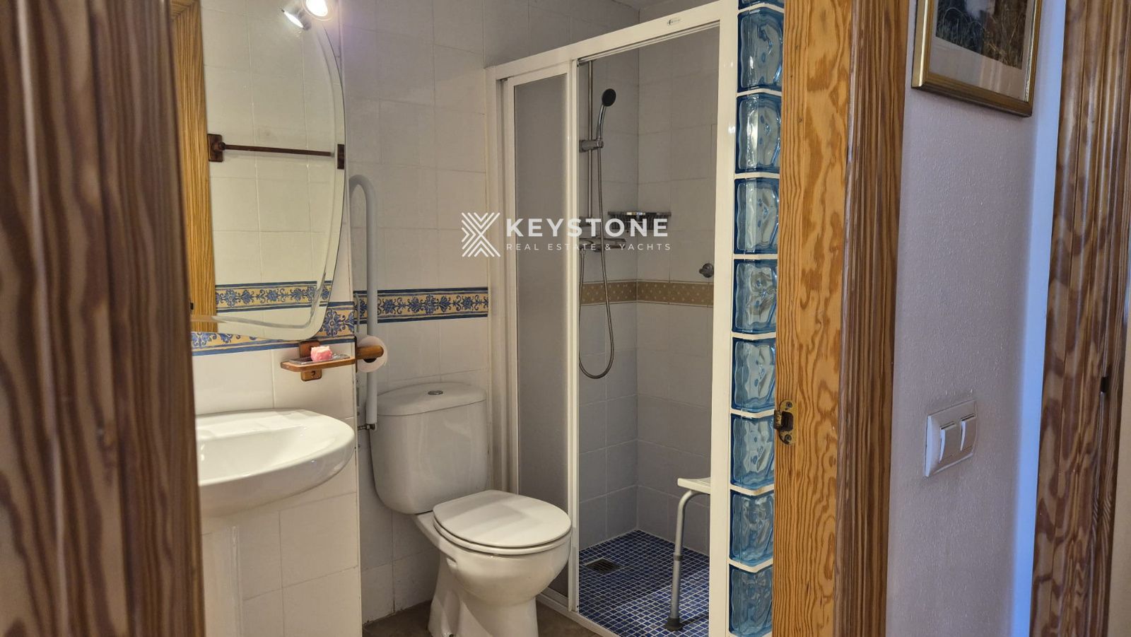 It offers three double bedrooms with fitted wardrobes and two full bathrooms, one en suite. The kitchen-dining area and bright living room open directly onto a south-facing terrace, perfect for relaxing under the Mediterranean sun.