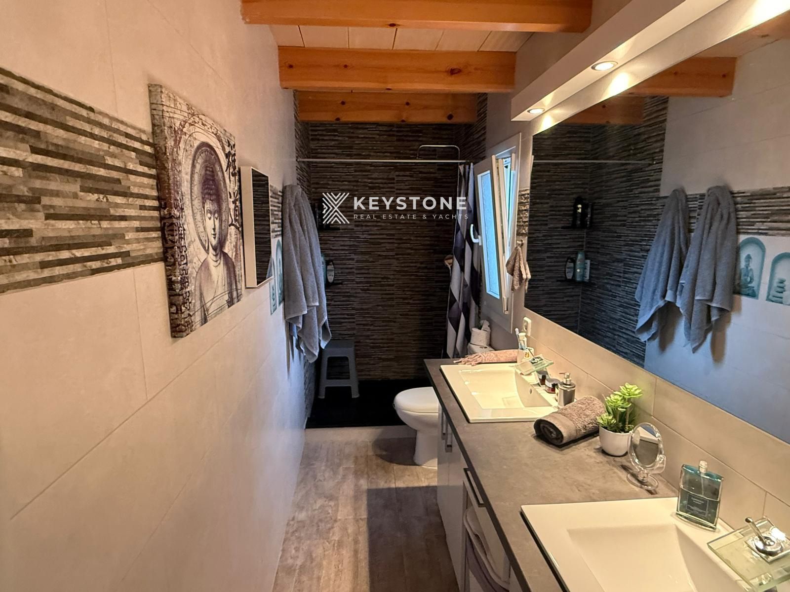 The property also includes a guest apartment, ideal for friends or family, featuring an open kitchen, bright living-dining room, double bedroom with en-suite bathroom, and stunning views over the garden and pool.