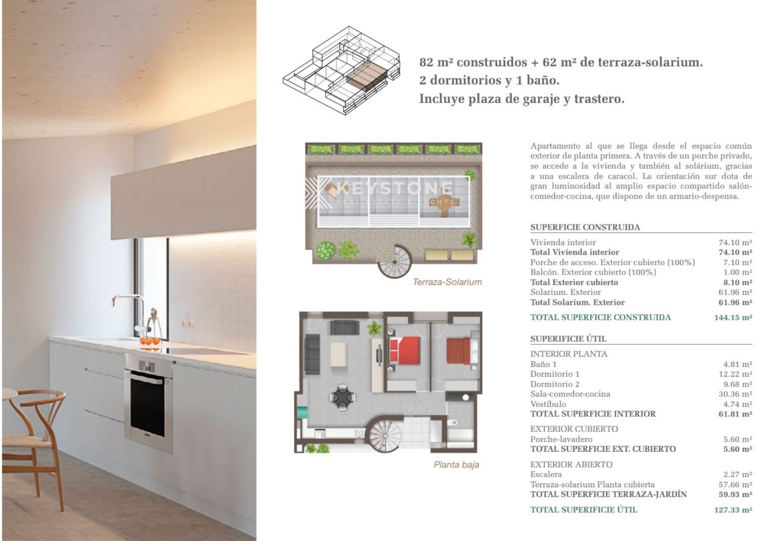 Desde un porche privado se accede tanto a la vivienda como al solárium en planta cubierta, al que se llega mediante una elegante escalera de caracol, aportando privacidad y carácter a la propiedad. La superficie total construida es de 144,15 m² y la útil total de 127,33 m². Incluye plaza de garaje de 11 m² y trastero de 4 m², ofreciendo comodidad y espacio adicional de almacenamiento. Disponible a partir del 01/09/2026.